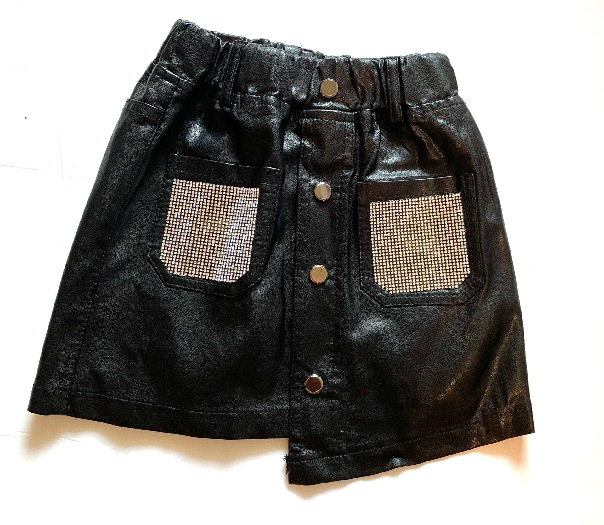 Black Mini leather style skirt. Bling pockets in the front with bling fringe
