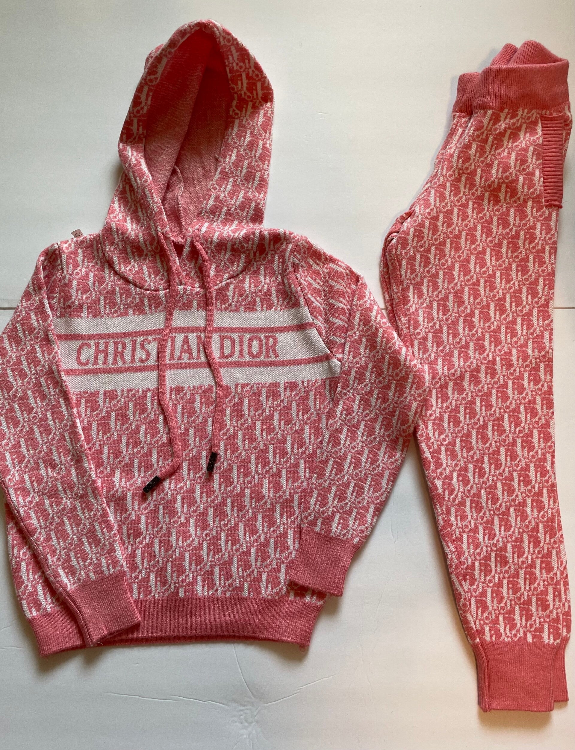 This 2 piece knit hoodie and knit pants in pink Dior print